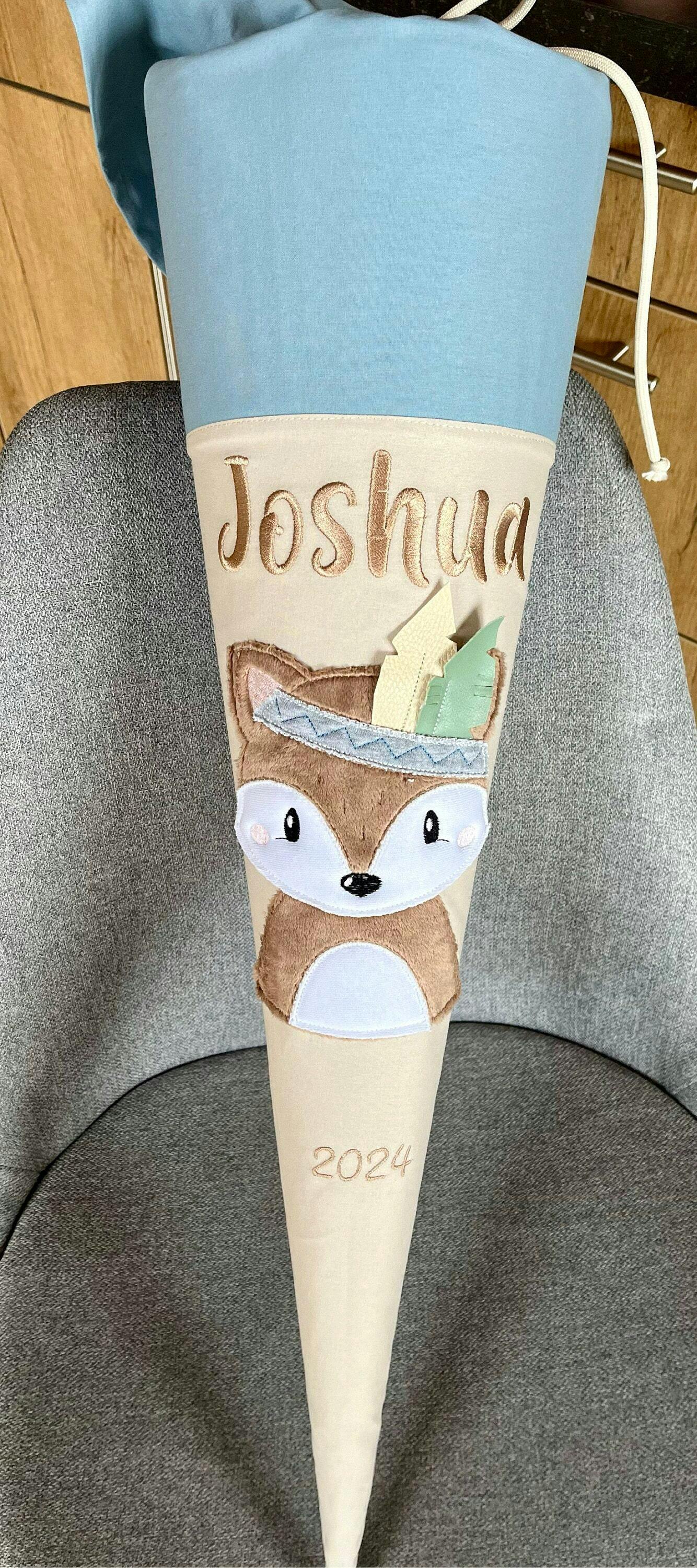 Diese handgefertigte Schultüte in edlem Sand und dusty blue mit einem liebevoll gestalteten Boho Fuchs wird zum schlauen Highlight für den ersten Schultag. Die Schultüte ist personalisiert mit deinem Wunschnamen und bietet eine wunderschöne Erinnerung, die nach der Einschulung als kuscheliges Dekokissen genutzt werden kann. Pappe raus, Kissen rein.
