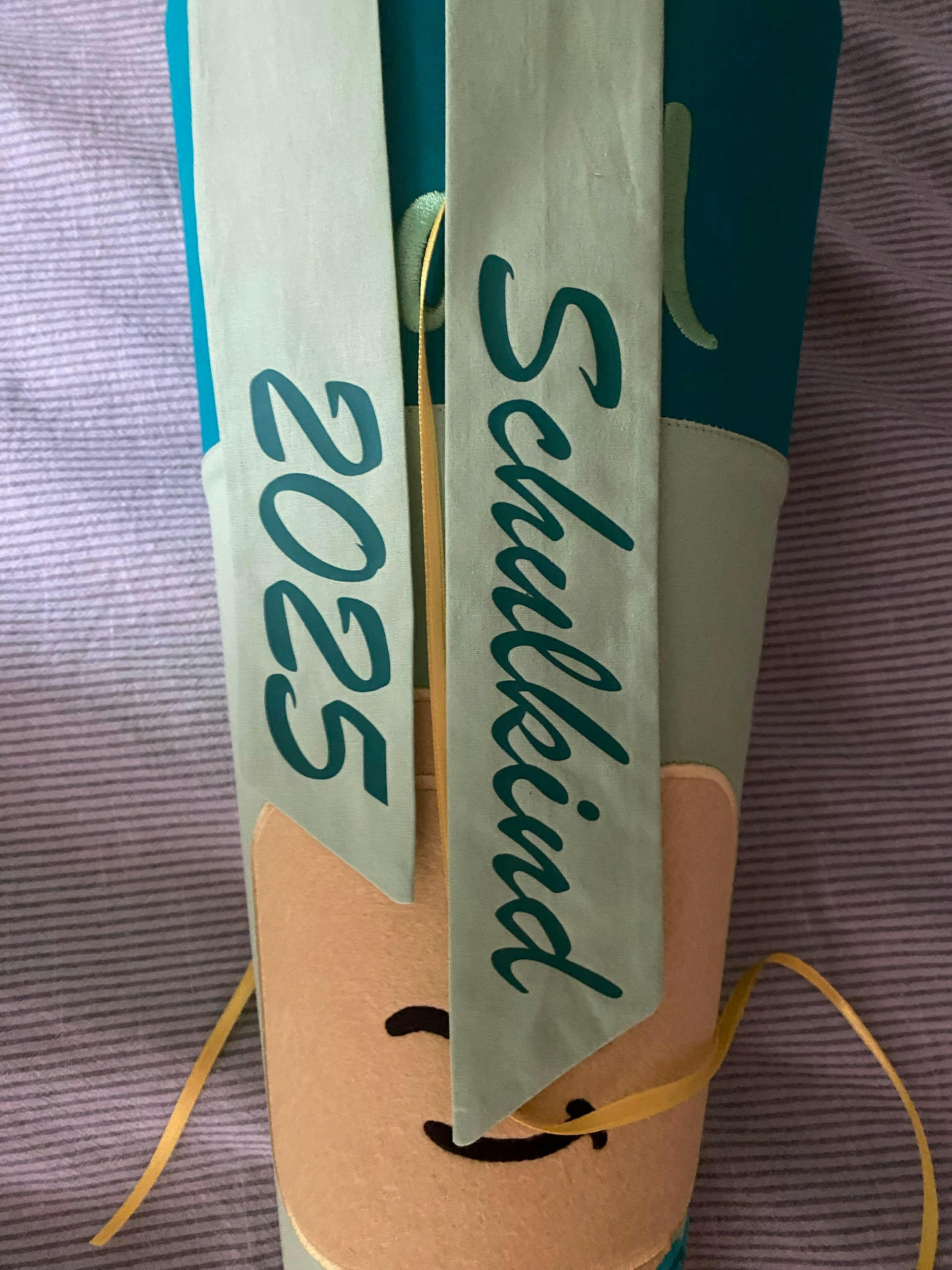 Die Stoffschleife wird regulär mit „Schulkind + Jahr“ bedruckt oder kann auf Wunsch individuell bedruckt werden (➡️ Stoffschleifen ansehen)