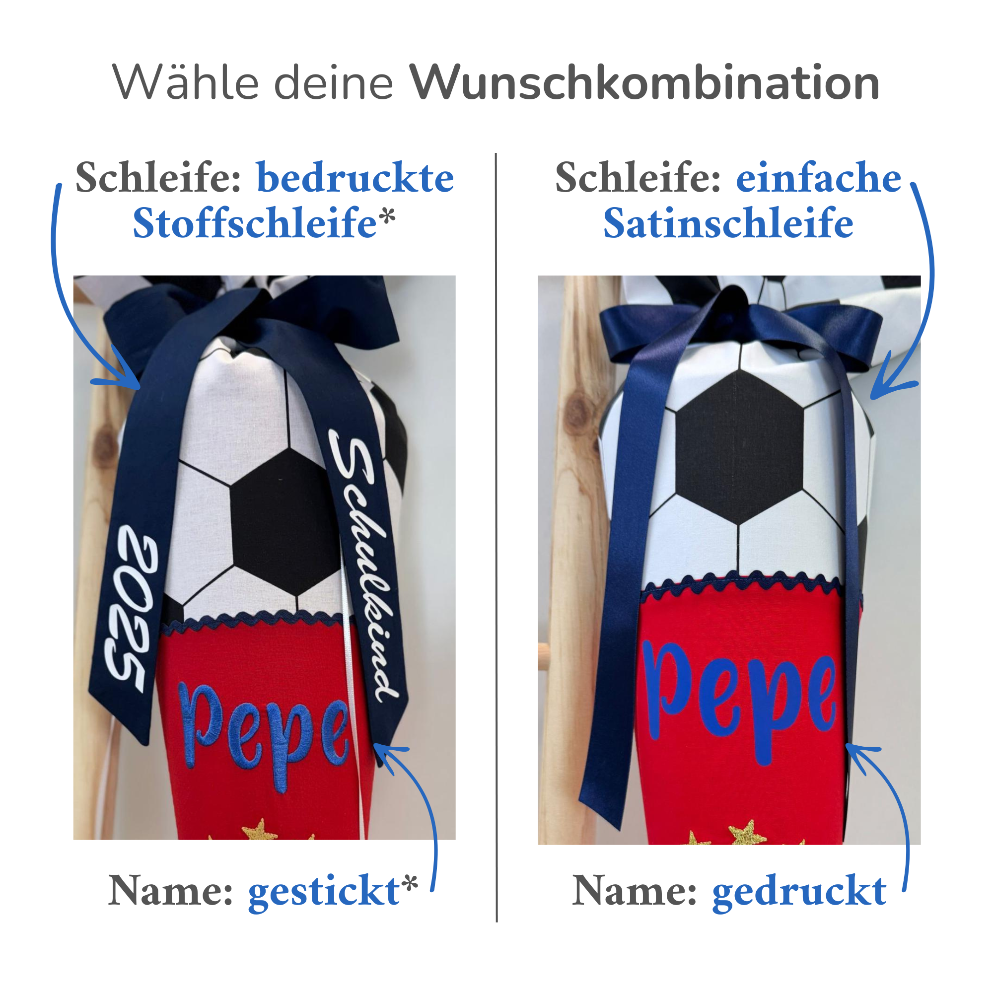 Du kaufst ein Unikat, das für Dich angefertigt wird. Jede Schultüte wird von Hand zugeschnitten, genäht, gebügelt und individuell veredelt. Die Farben können daher saisonal und je nach Verarbeitung bzw. Monitoreinstellung leicht vom Beispielbild abweichen.