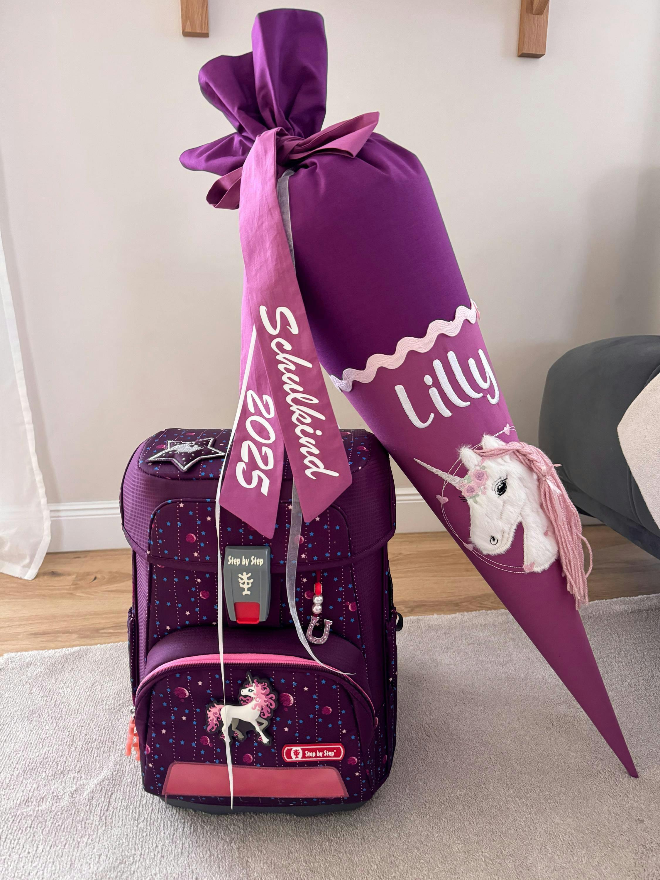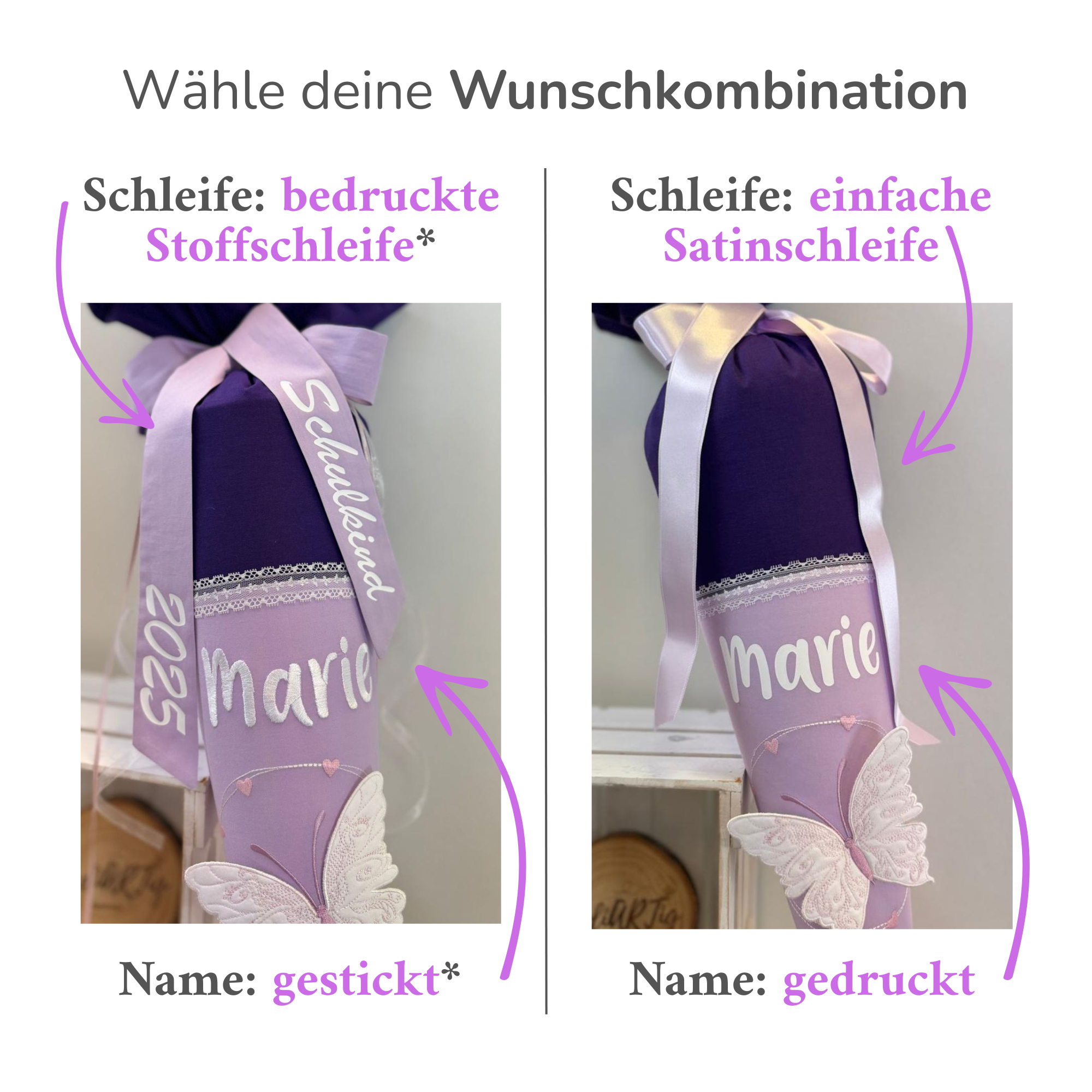 - Optional Schleife: Hochwertiges Satinband oder passend zur Schultüte genähte und bedruckte Stoffschleife 'Schulkind + Jahr' – oben auswählbar.