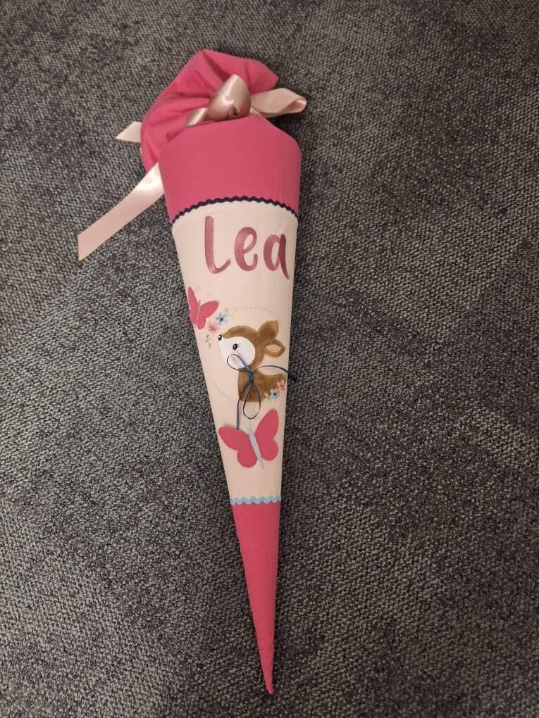Diese handgefertigte Schultüte in grün & hellem puderrosa mit einem süßen Rehkitz und zwei 3D-Schmetterlingen in Beere wird zum liebevollen Highlight für den ersten Schultag. Die Schultüte ist personalisiert mit deinem Wunschnamen und bietet eine wunderschöne Erinnerung, die nach der Einschulung als kuscheliges Dekokissen genutzt werden kann. Pappe raus, Kissen rein.
